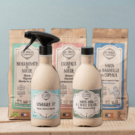 Het pak maakt jezelf is samengesteld uit baksuiverte, frisdrankkristallen, Marseille zeepchips, 14 ° azijn en zwarte zeep met olijfolie.